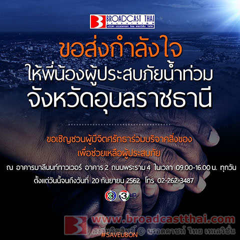 16-09-2562 : ทีม #broadcastthaitv #เพลิงรักเพลิงแค้น #ลิขิตรักข้ามดวงดาว ขอร่วมส่งกำลังใจให้พี่น้องชาวอุบลราชธานี ที่ประสบภัยน้ำท่วม และขอเชิญชวนผู้มีจิตศรัทธาร่วมบริจาคสิ่งของเพื่อช่วยเหลือผู้ประสบภัยได้ที่ อาคารมาลีนนท์ทาวเวอร์ อาคาร 2 ถนนพระรามสี่ ในเวลา 9.00-16.00 น. หรือ ติดต่อสอบถามได้ที่เบอร์ 02-262-3487 #SAVEUBON