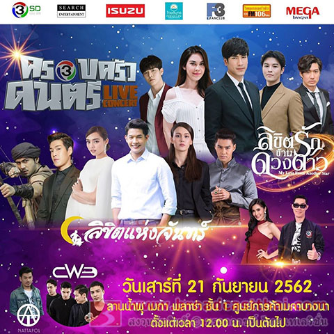 21-09-2562 : ครอบครัวดนตรี LIVE CONCERT ขนทัพทีมซุปตาร์จากละครฟอร์มยักษ์แห่งปี #ลิขิตรักข้ามดวงดาว นำโดย ณเดชน์ คูกิมิยะ,แมท ภีรนีย์ ร่วมด้วย มาสุ จรรยางค์ดีกุล, เดี่ยว สุริยนต์ ,ก็อต อิทธิพัทธ์ พบกัน ได้ในวันเสาร์ที่ 21 กันยายน 2562 ที่ลานน้ำพุ เมกา พลาซ่า ชั้น 1 ศูนย์การค้าเมกาบางนา ตั้งแต่เวลา 12.00 น. เป็นต้นไป #ครอบครัวดนตรีLiveConcert #ch3concert #ch3thailand