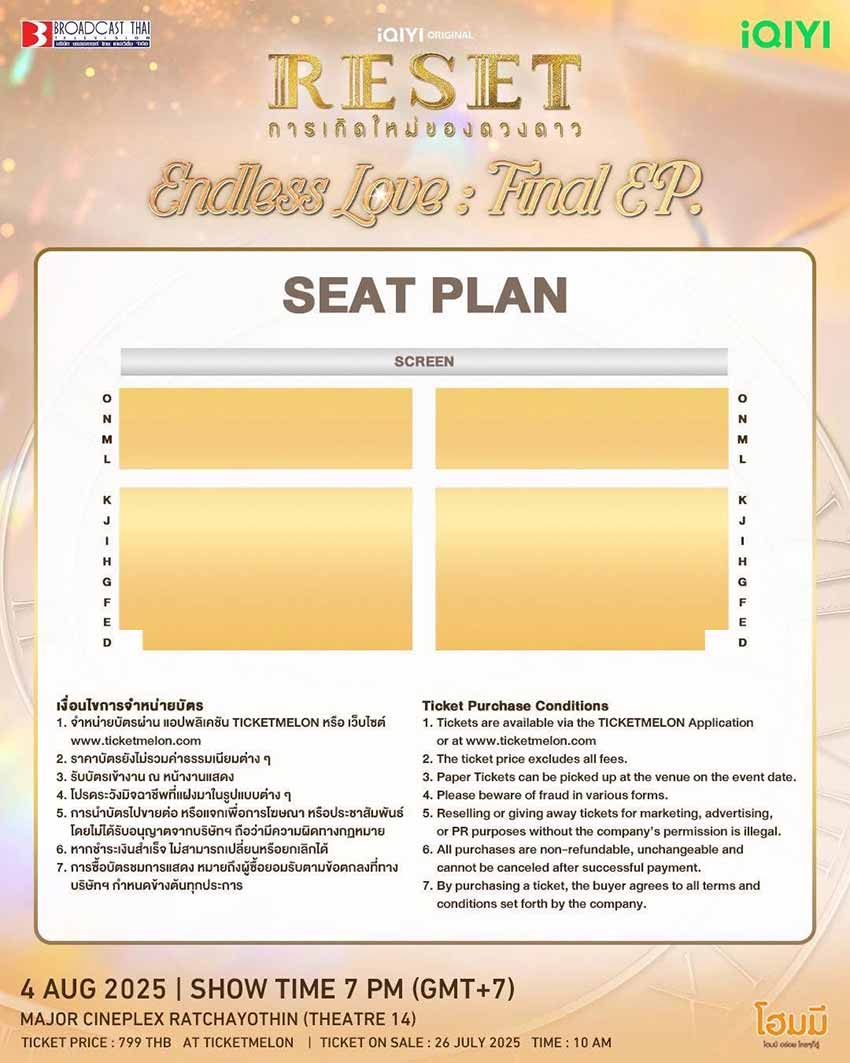 19-07-2568 : *** SEAT PLAN & FAN BENEFIT *** - R U READY TO MEET US for iQiYi Original ?RESET? ENDLESS LOVE : FINAL EP. Let's celebrate the finale together - Date: 4 August 2025 - Showtime: 07:00 PM - Venue: Major Cineplex Ratchayothin ? Theatre 14 #R