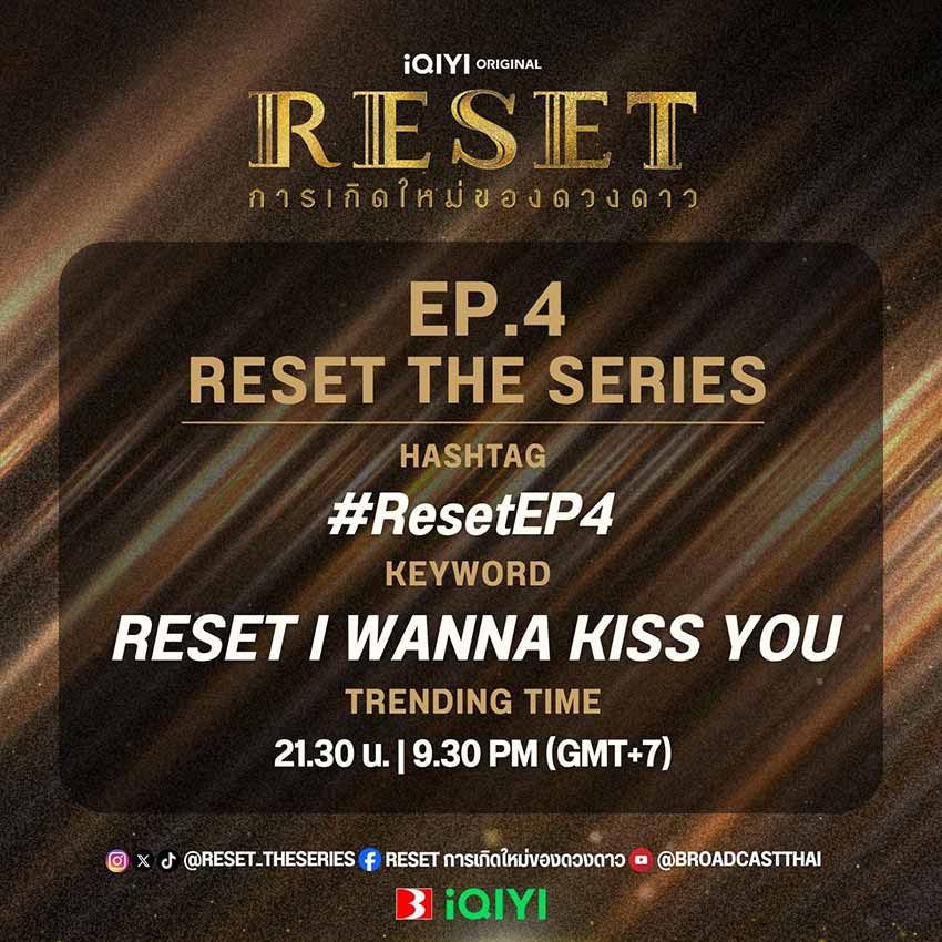 23-06-2568 : On Mondays !! *** Trending Time : 21:30 น. | 09:30 PM (GMT+7) Keyword : RESET I WANNA KISS YOU Hashtag : #.ResetEP4 *** ดูสดทุกวันจันทร์ เวลา 22.30 น. ทางช่อง 3HD และดูออนไลน์เวอร์ชัน UNCUT เวลา 22.45 น. บนแอป #iQIYI และเว็บ iQ.com ที่เดียวเท่านั้