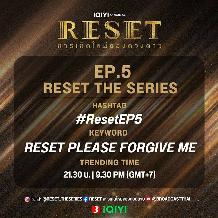 30-06-2568 : *** Trending Time : 21:30 น. | 09:30 PM (GMT+7) Keyword : RESET PLEASE FORGIVE ME Hashtag : #.ResetEP5 *** ดูสดทุกวันจันทร์ เวลา 22.30 น. ทางช่อง 3HD และดูออนไลน์เวอร์ชัน UNCUT เวลา 22.45 น. บนแอป #iQIYI และเว็บ iQ.com ที่เดียวเท่านั้น #ResetTheSeri