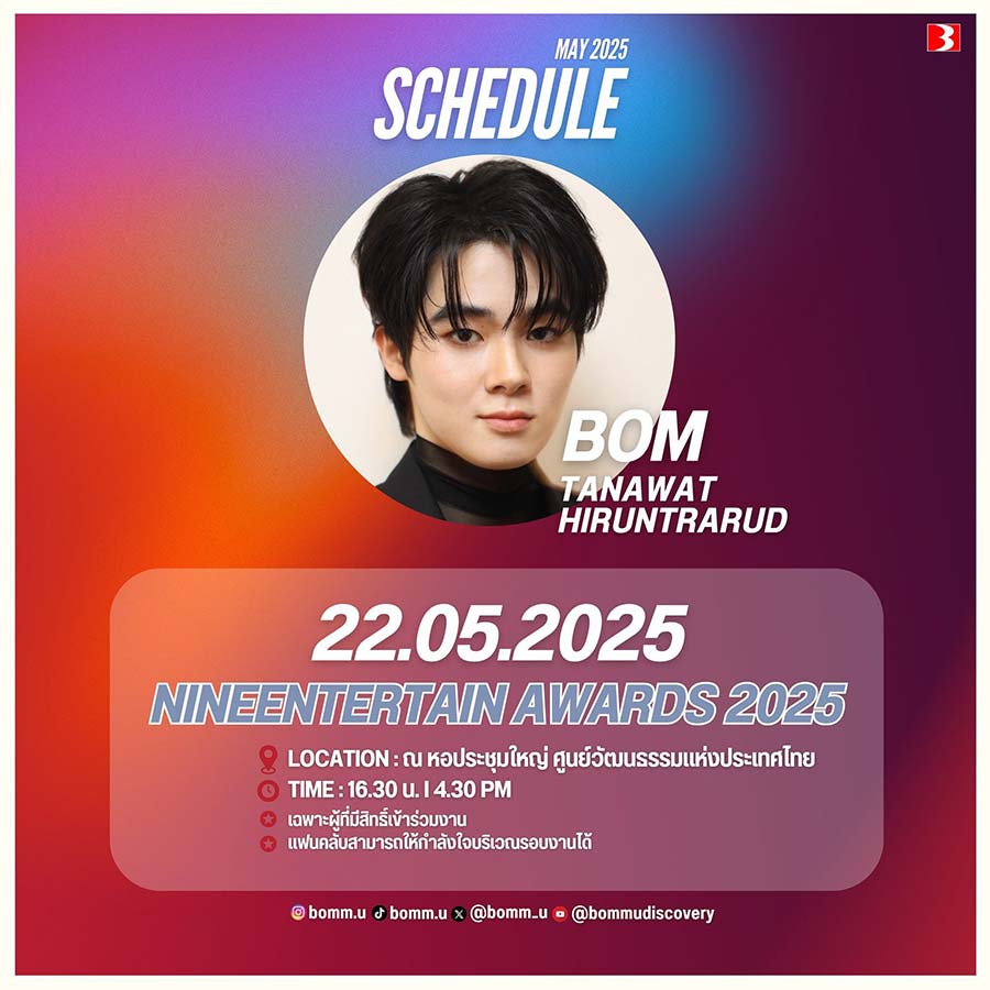 16-05-2568 : ***Event RESET THE SERIES*** NINEENTERTAIN AWARDS 2025 * 22 MAY 2025 * : 16.30 น. I 4.30 PM (GMT+7) * : ณ หอประชุมใหญ่ ศูนย์วัฒนธรรมแห่งประเทศไทย (Thailand Cultural Centre) ให้กำลังใจบริเวณรอบงานได้ * งดรับของขวัญ * Fans can join in the surroundi