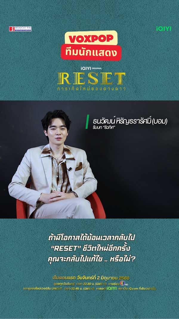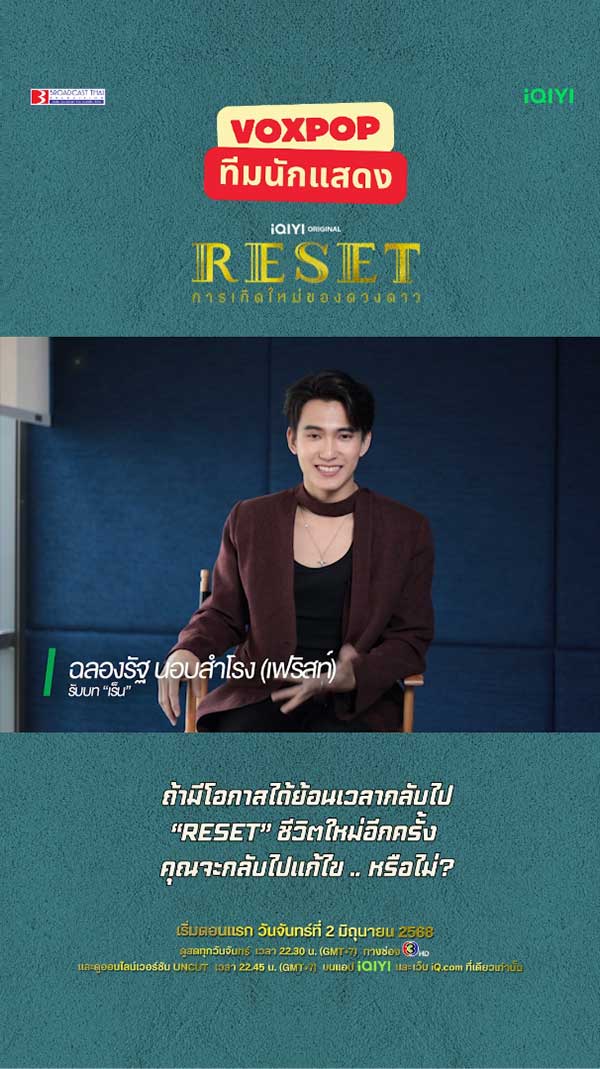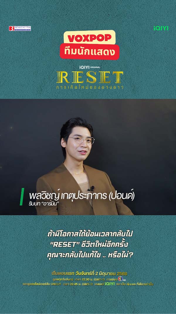 28-05-2568 : 2 คำที่ #yardpirun_poolun อยากบอกกับซีรีส์เรื่องนี้คือ .. ! - เริ่มตอนแรก 2 มิถุนายนนี้ - ดูสดทุกวันจันทร์ เวลา 22.30 น. ทางช่อง 3HD ดูออนไลน์เวอร์ชัน UNCUT เวลา 22.45 น. บนแอป #iQIYI และเว็บ iQ.com ที่เดียวเท่านั้น https://s.iq.com/Reset_TH #ห