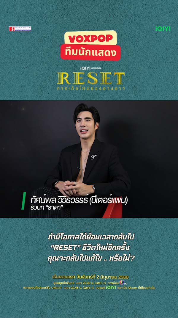 24-05-2568 : แนะนำตัวละครจาก ซีรีส์ #Resetการเกิดใหม่ของดวงดาว *** เริ่มตอนแรก 2 มิถุนายนนี้ *** ดูสดทุกวันจันทร์ เวลา 22.30 น. ทางช่อง 3HD ดูออนไลน์เวอร์ชัน UNCUT เวลา 22.45 น. บนแอป #iQIYI และเว็บ iQ.com ที่เดียวเท่านั้น https://s.iq.com/Reset_TH #ResetTheSe