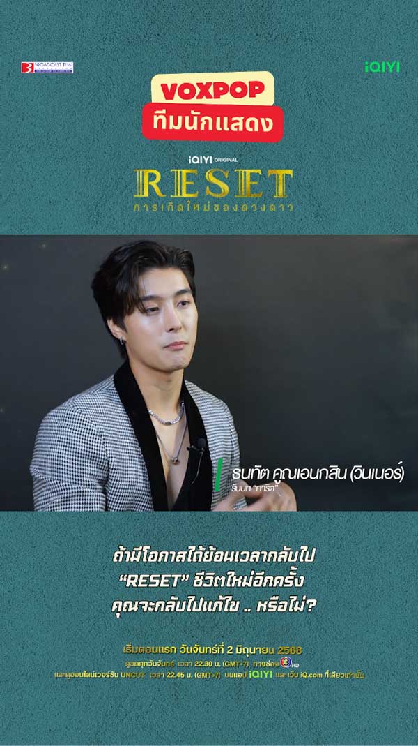 29-05-2568 : จากตัวละครแล้ว #shell_thakrit ขอมอบ 2 คำให้เลยกับซีรีส์เรื่องนี้เลย - เริ่มตอนแรก 2 มิถุนายนนี้ - ดูสดทุกวันจันทร์ เวลา 22.30 น. ทางช่อง 3HD ดูออนไลน์เวอร์ชัน UNCUT เวลา 22.45 น. บนแอป #iQIYI และเว็บ iQ.com ที่เดียวเท่านั้น https://s.iq.com/Reset_