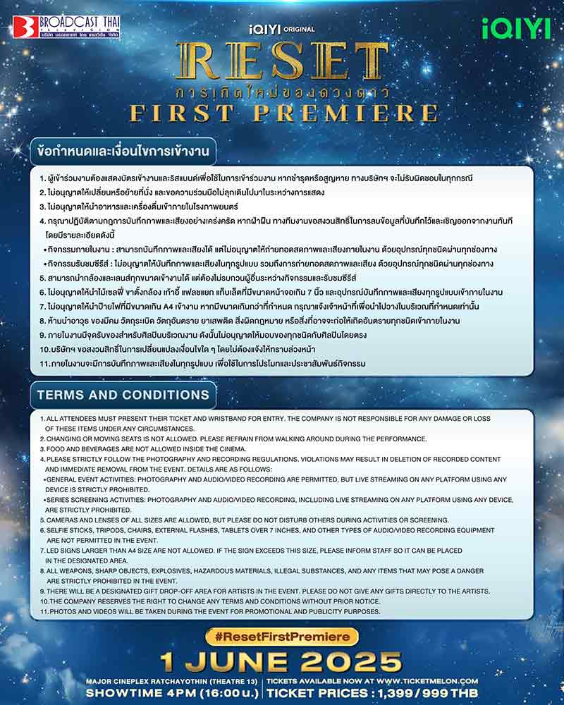 26-05-2568 : ข้อกำหนดและเงื่อนไขในการเข้างาน "RESET การเกิดใหม่ของดวงดาว : FIRST PREMIERE" TERMS AND CONDITIONS FOR "RSET การเกิดใหม่ของดวงดาว : FIRST PREMIERE" *** On : 1 JUNE 2025 *** Location : Major Cineplex Ratchayothin Theatre 13 - Show time : 4 PM (16.00